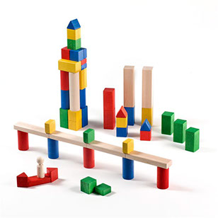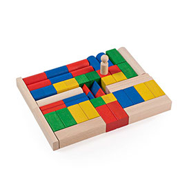 Furthermore there is the possibility to play a time based game: the winner is the one who complete the chosen subject in the shortest time. Wooden cylinders, rectangles, cubes, triangles in yellow, red, green and blue. The children learn quickly to recognize those shapes and colours. All the blocks of this building toy are easy to handle and to be put on top of each other.