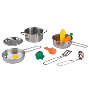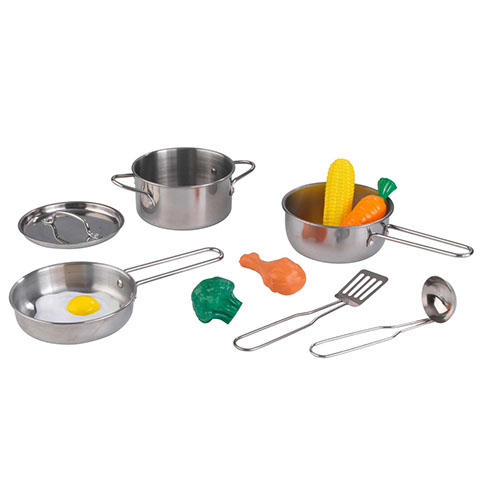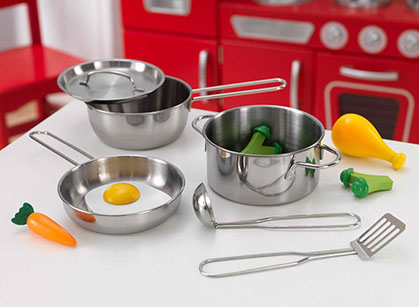 With our real metal, kid-sized KidKraft Deluxe Cookware Set with food, little chefs can pretend to cook just like Mom and Dad. This 11-piece set is built to stand up to even the most enthusiastic imaginations for years to come. With a pot, pans, utensils and play food, this set is ready to enjoy right out of the box, or with any of our kitchen playsets.