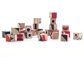 25 colourful, hand-printed rubberwood blocks with different geometric patterns on each block face