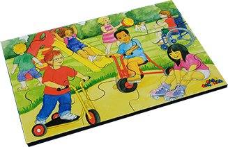 This wooden set includes 6 sets. Fun in the Kitchen, Story Time, Online Fun, Fun at the Seaside, Water Play & Fun at the Park.
