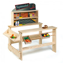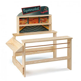 This shop is the supermarket version for the child’s room or nursery. Designed with three-dimensional playing facilities, it provides an ideal space for acting out a whole number of different play themes. Loads of shelving space – large and small – can be used to inspire individual creativity. The shop is delivered in a dissembled, space-saving state.